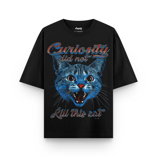 Oversized Black Curiosity Cat T-shirt - Heavy 250 GSM Cotton
